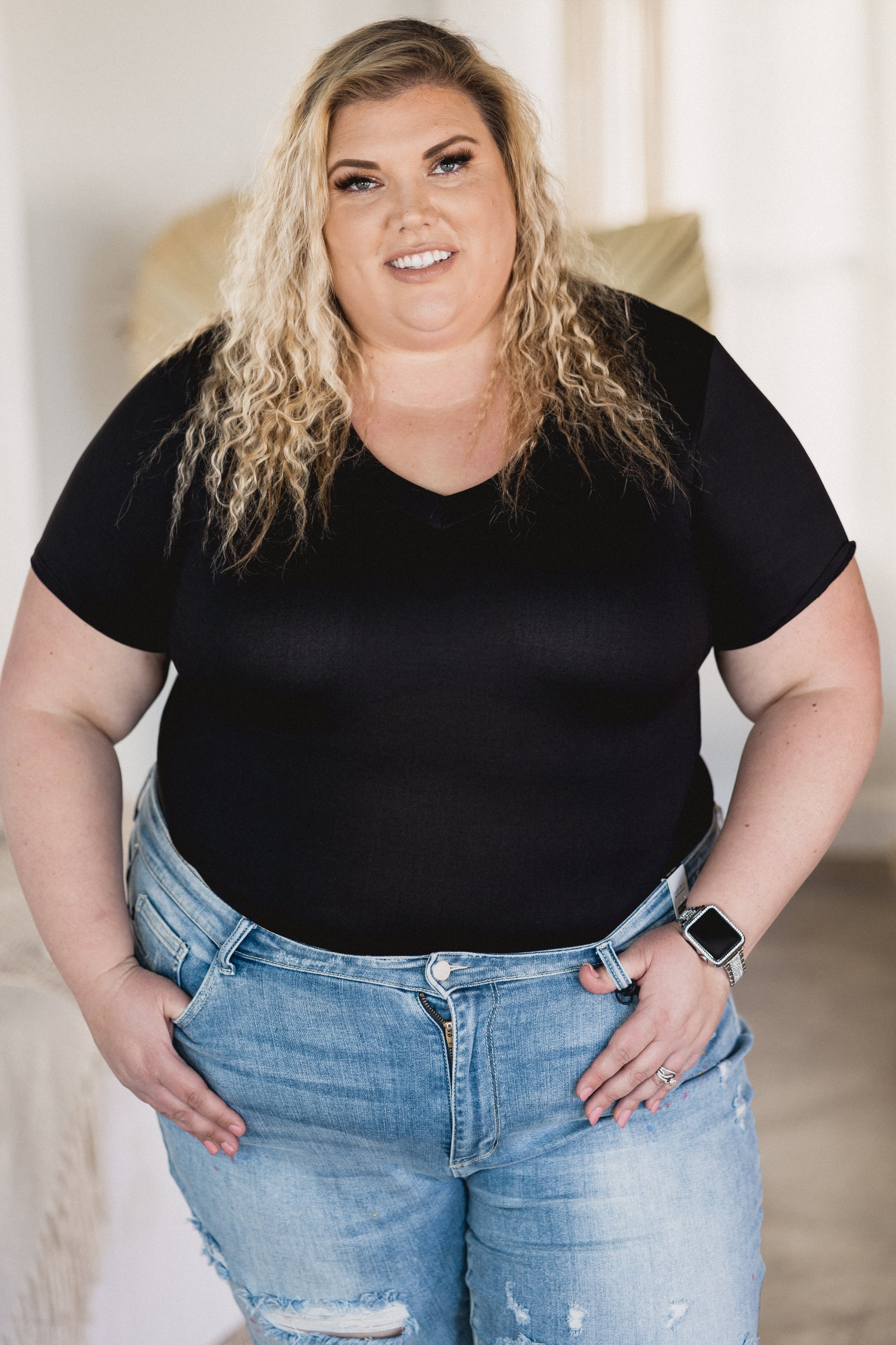 Whatever you decide to pair this buttery soft bodysuit with, you will be all put together! Bodysuits give you the perfect tuck, they are amazing to layer with, and they look great with just about any type of bottom (Jeans, Shorts, Skirts). With a fitted silhouette, this top features a v-neck, short sleeves and snap enclosure.