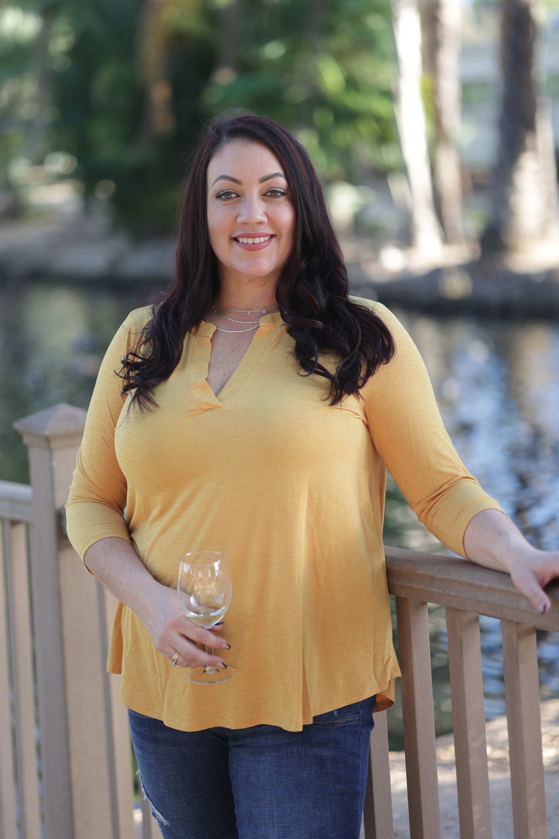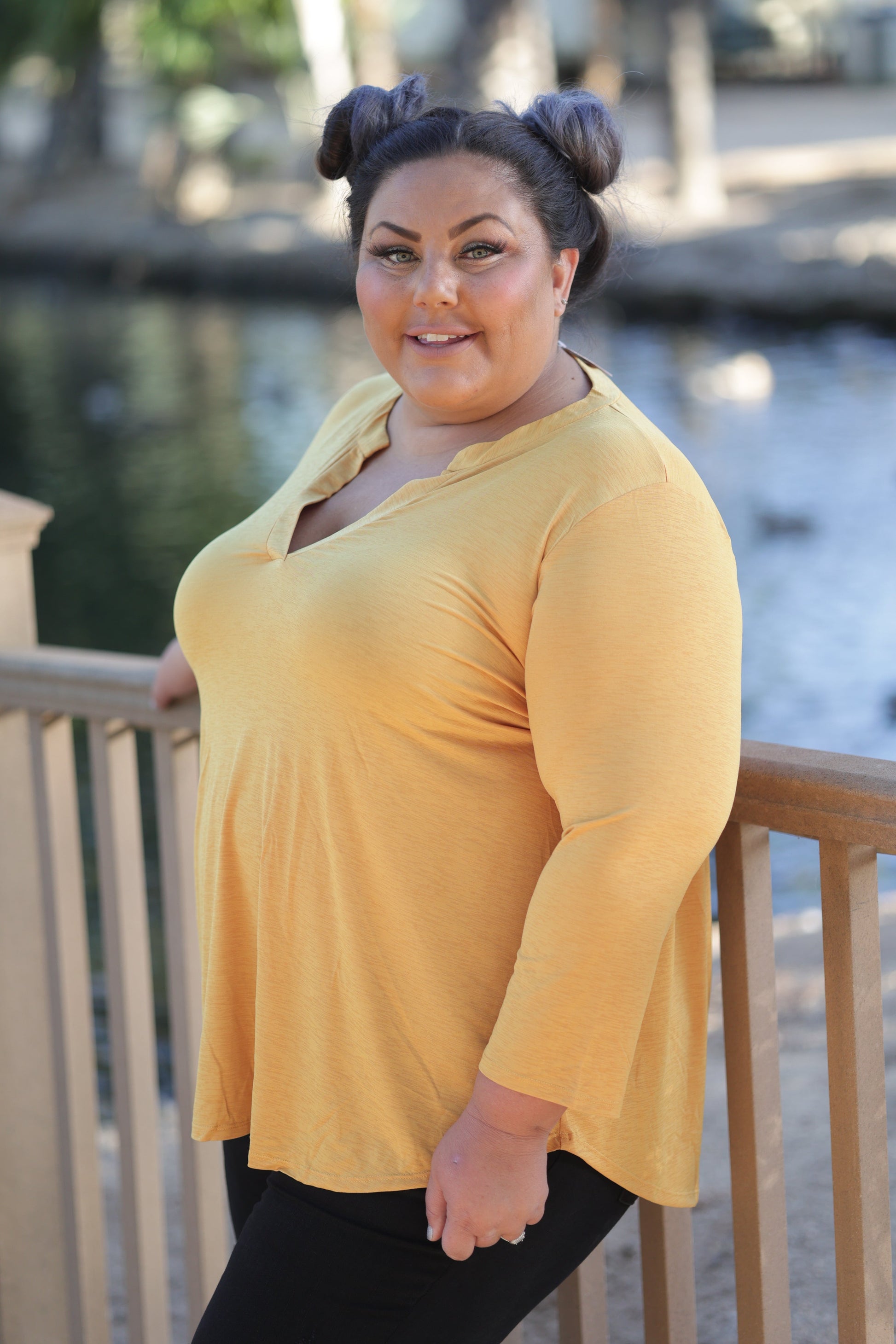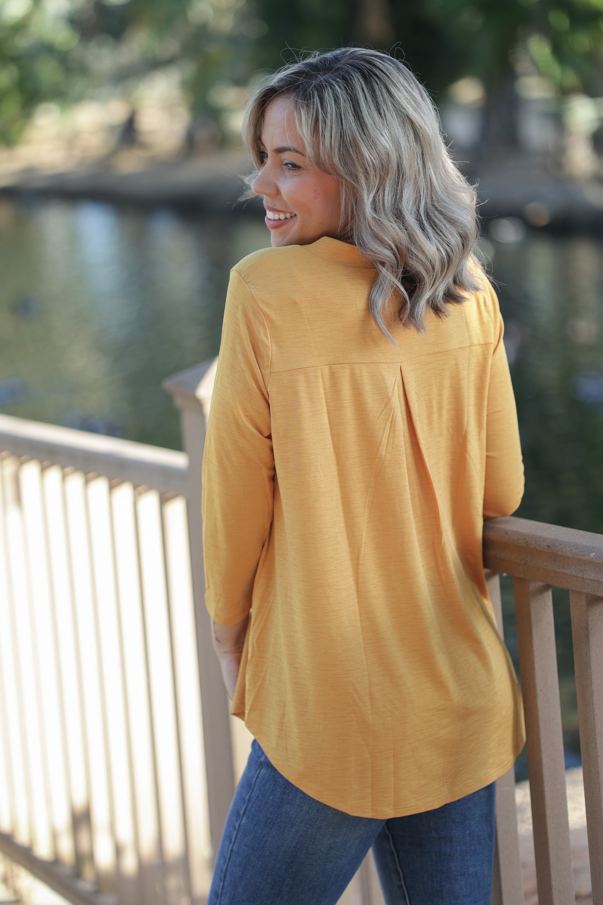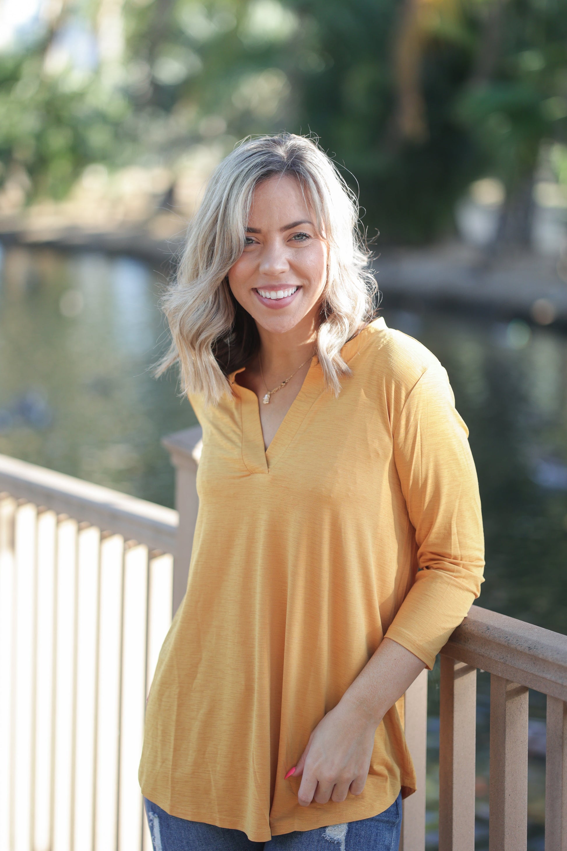 Searching for the perfect lightweight tunic? Look no further. Not to mention, a solid mustard one! Featuring a banded collar, v-neck and 3/4 sleeves, this top will make getting dressed seem effortless.