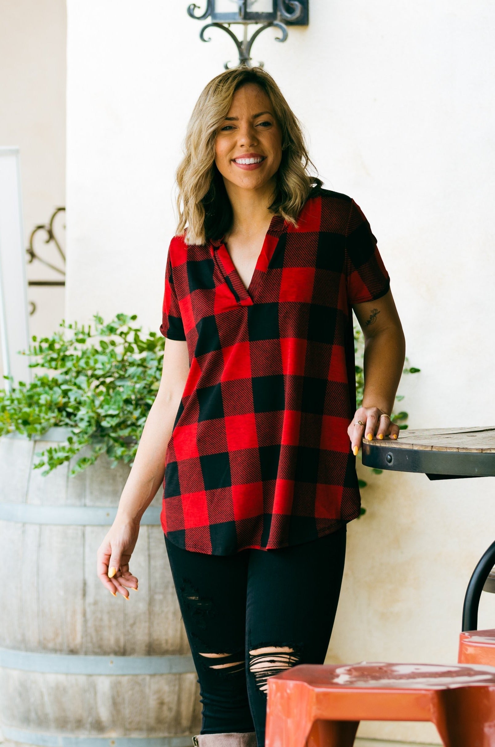 Searching for the perfect lightweight tunic? Look no further. Featuring a banded collar, v-neck and short sleeves, this top will make getting dressed seem effortless.