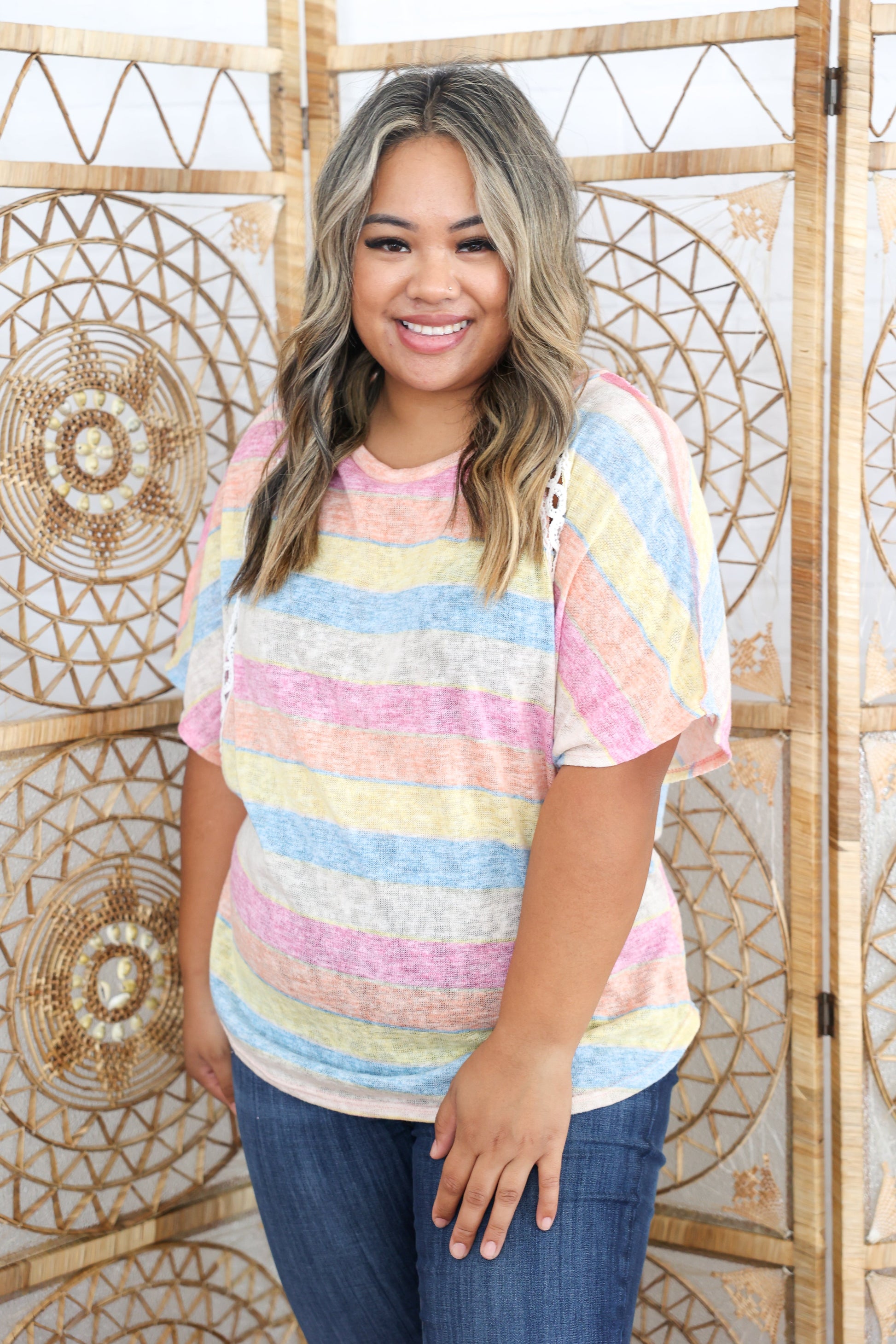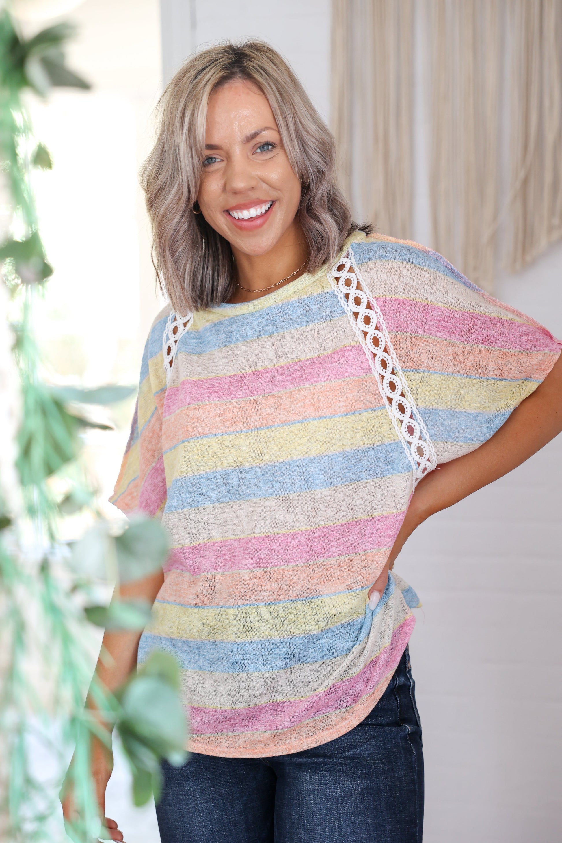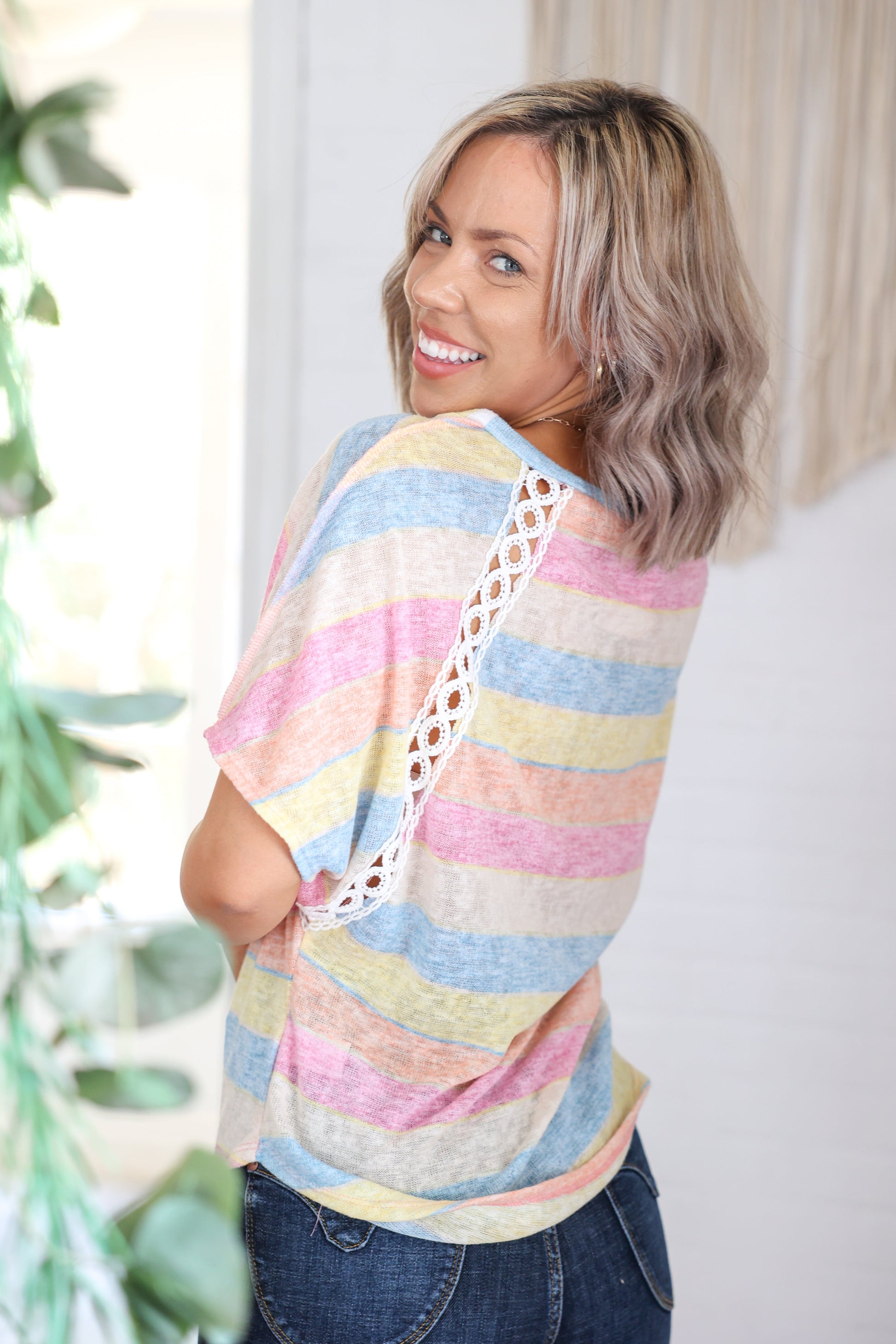 This lightweight short sleeve raglan reminds us of brighter days. With a relaxed fit, this top features a round neckline, crochet lace lining the raglan sleeves and tapered hem.