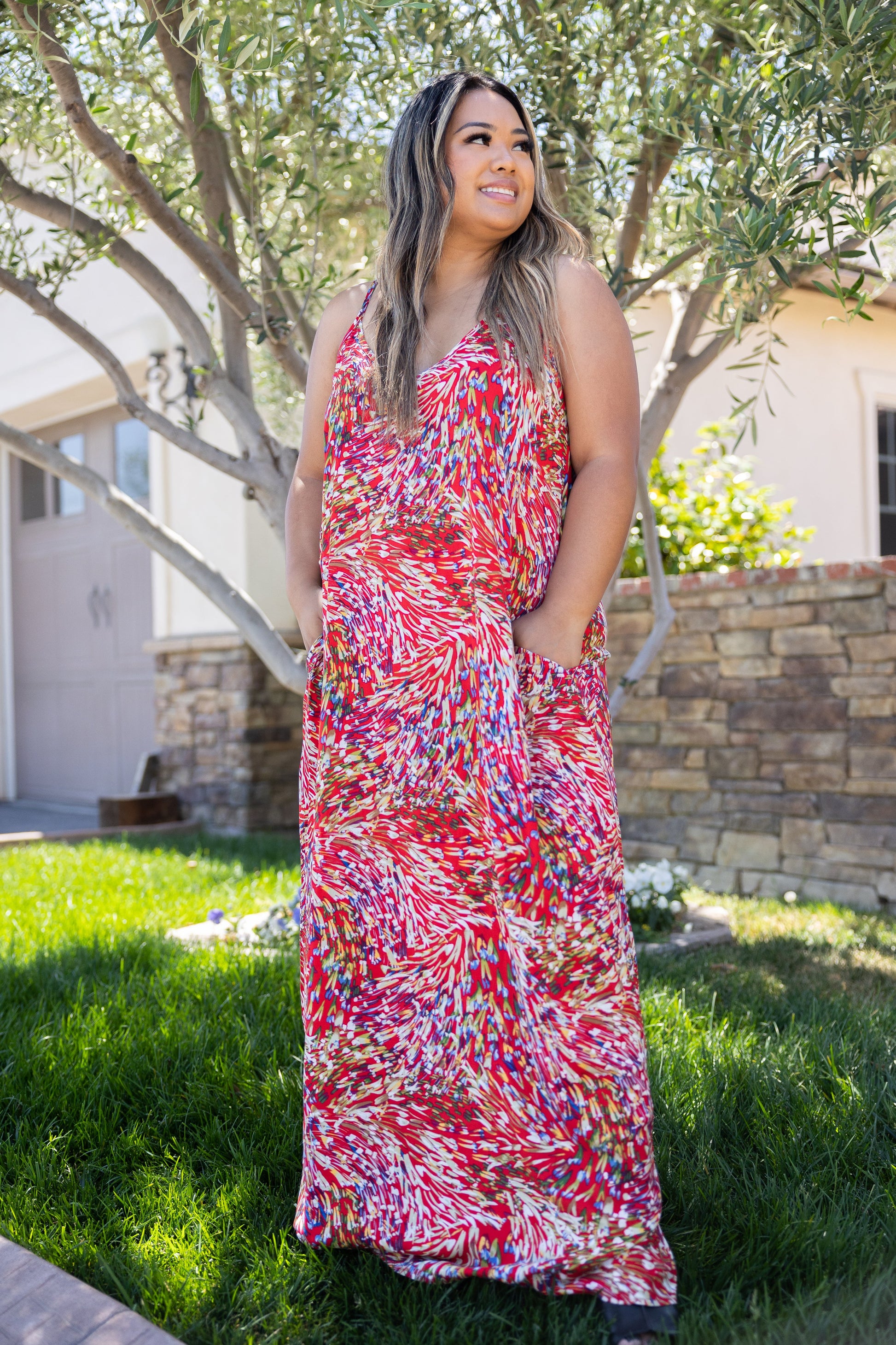 Flowy and majestic, this maxi dress will make all your dress dreams come true. Designed with a super slouchy silhouette, this dress features a v-neckline and side pockets!