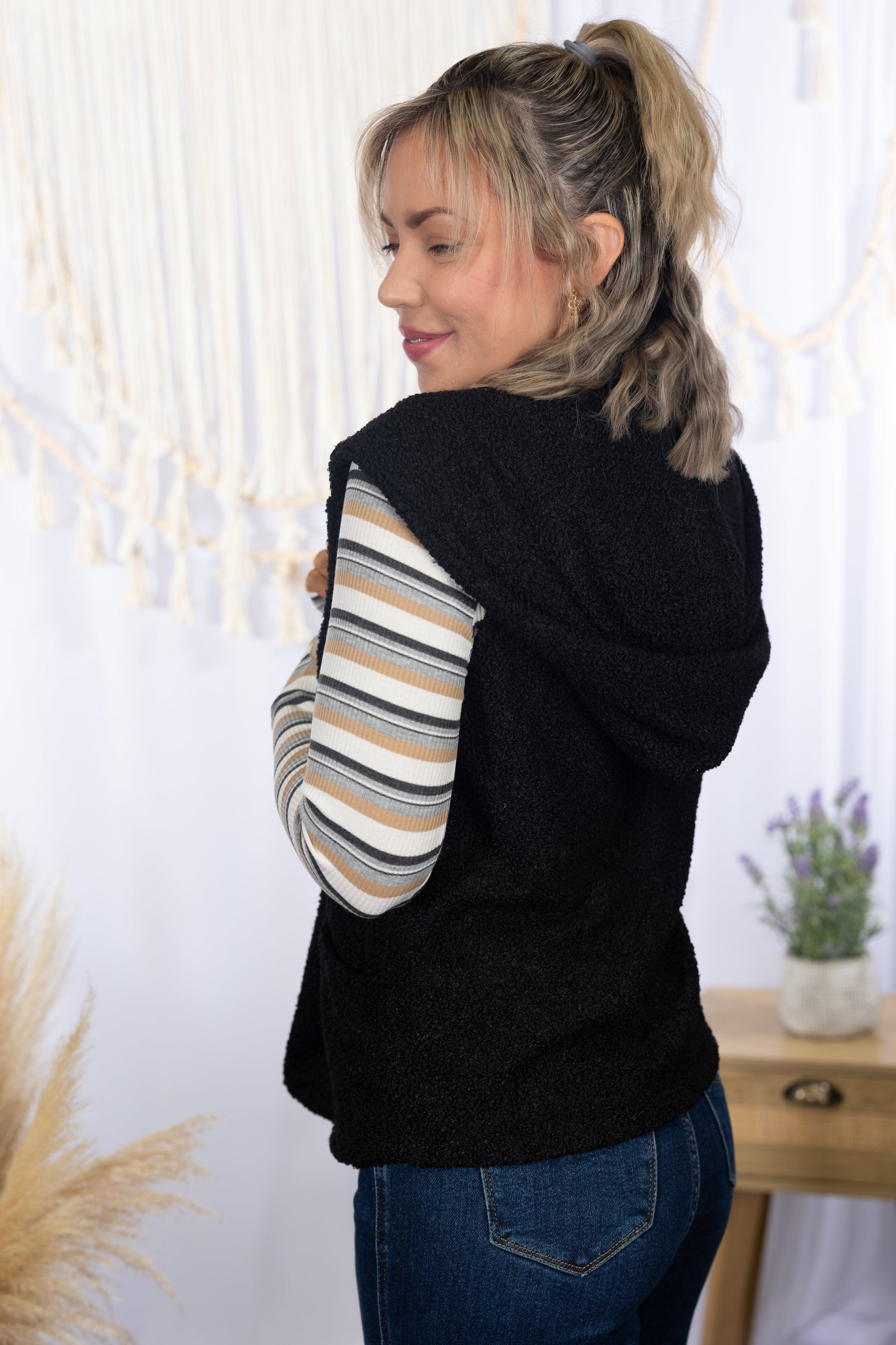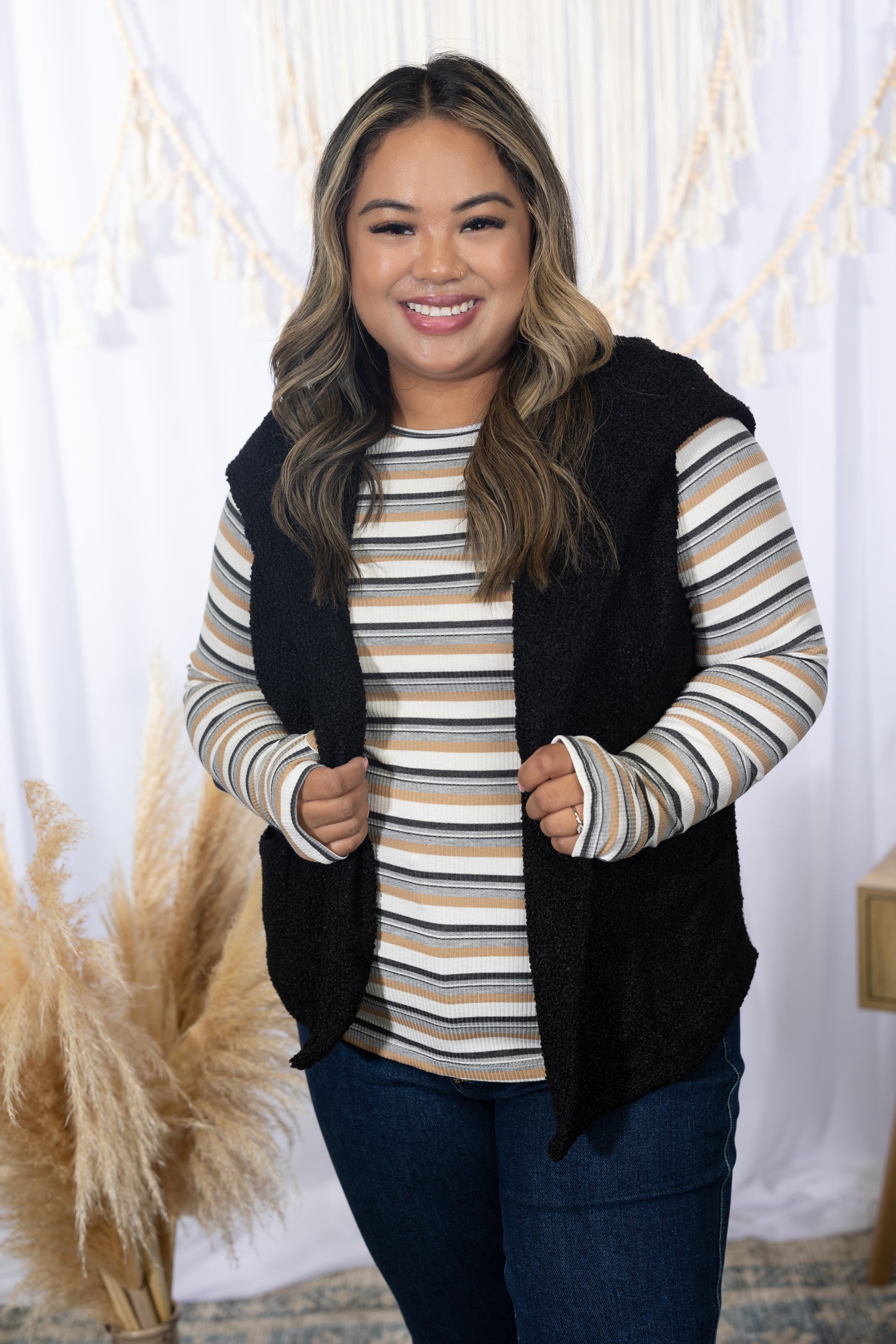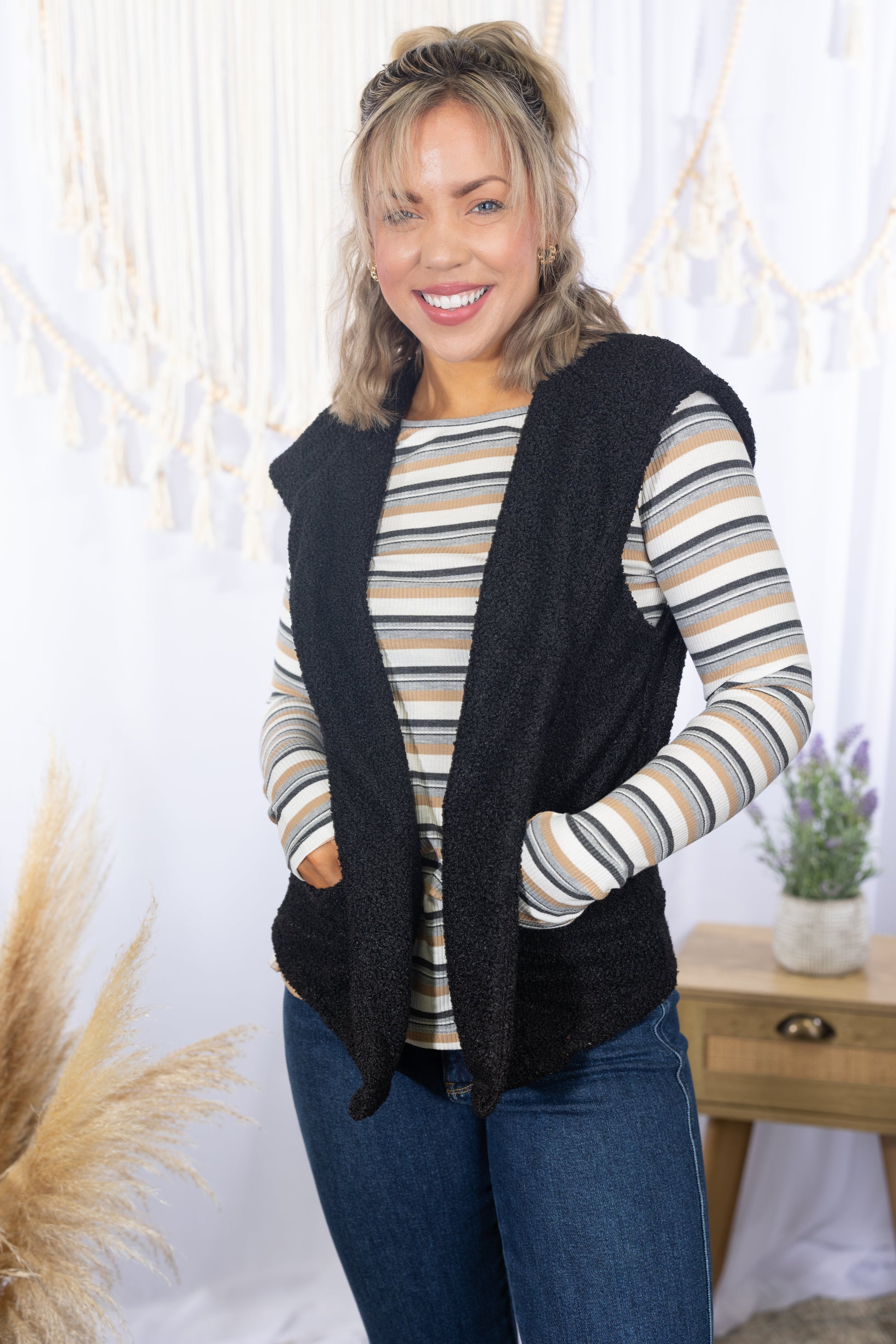 This Cuddle Me Sherpa Vest is the perfect way to keep warm on chilly days! Made with a soft and cozy sherpa fabric, it’s sleeveless to keep you comfortable and the open front and hood styling give you a hands-free way to stay snuggly and stylish all season long! Get your cuddle on and stay warm!