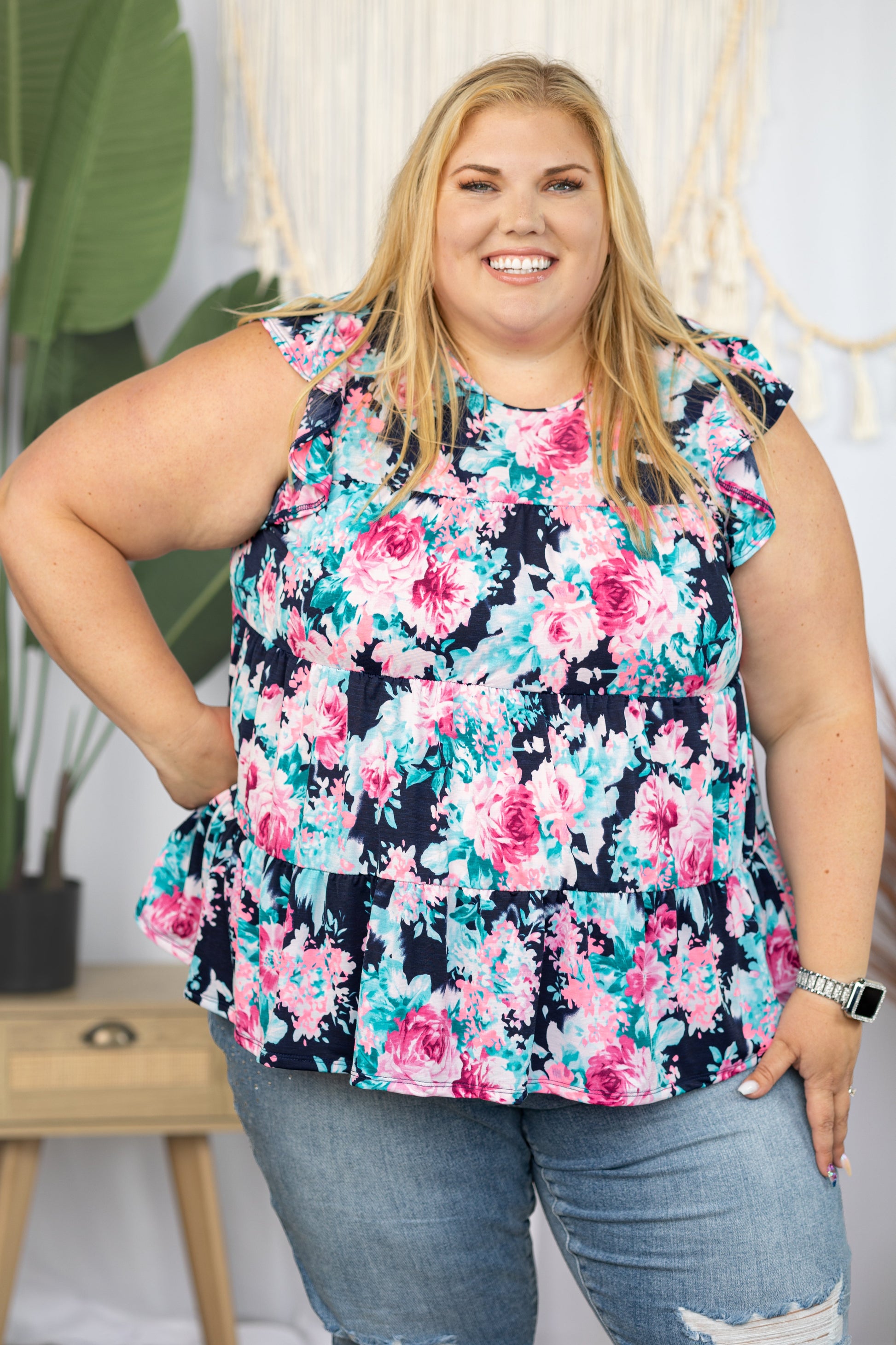 Make the world a brighter place in the Joyful Times Tiered Top! This versatile statement piece features a navy base with cheerful neon pink flowers set against an on-trend tiered hem and butterfly short sleeves. The rounded hem and round neckline complete the look for a fun, flirty top that's sure to make every day a blast!