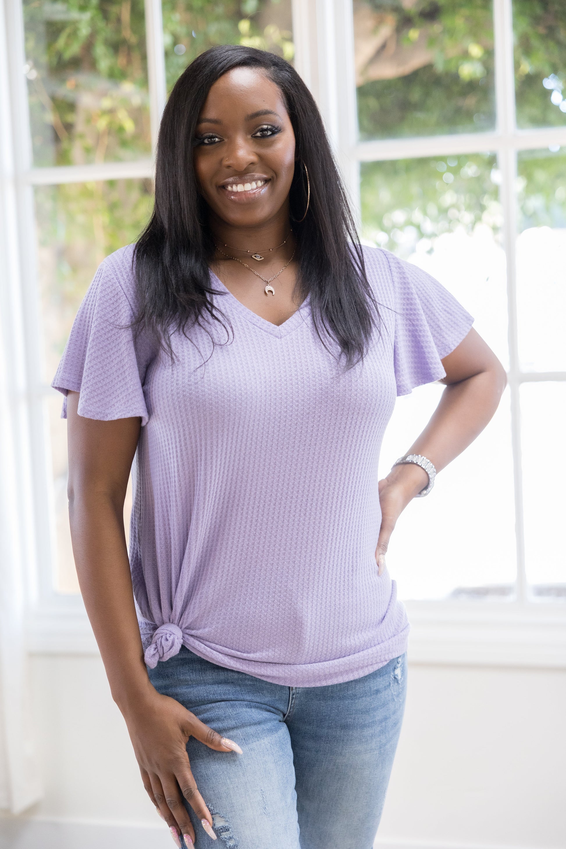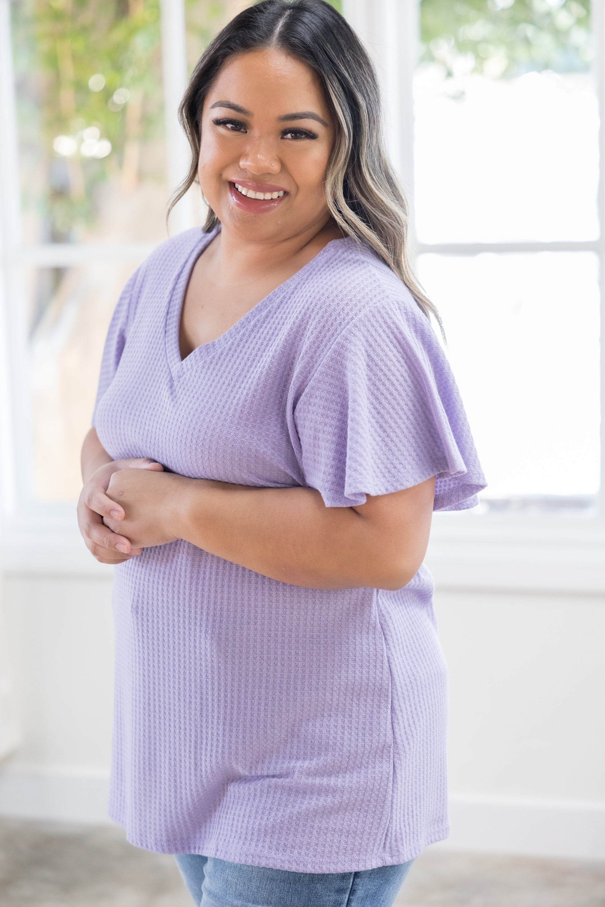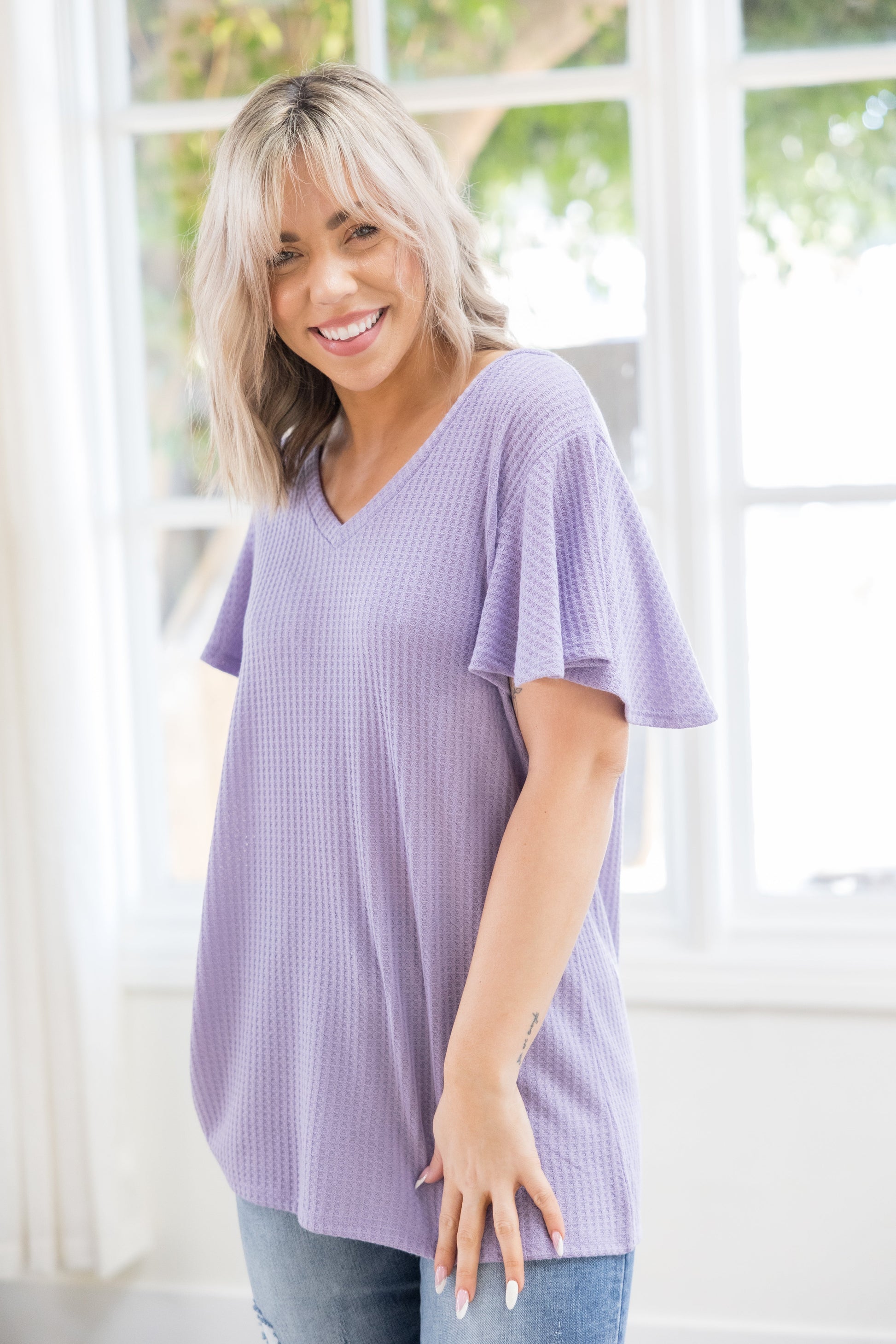 Knitted shirt pocket! Knitted border on the v-neck! & knitted everything else!!! This knit short sleeve will have many glad to meet you in lavender! Sleeves and waist cuffed about 1 inch in horizontal detail for the snuggest fit!