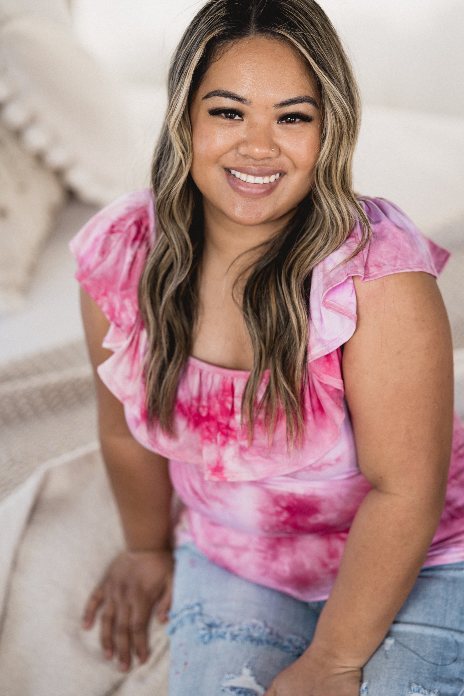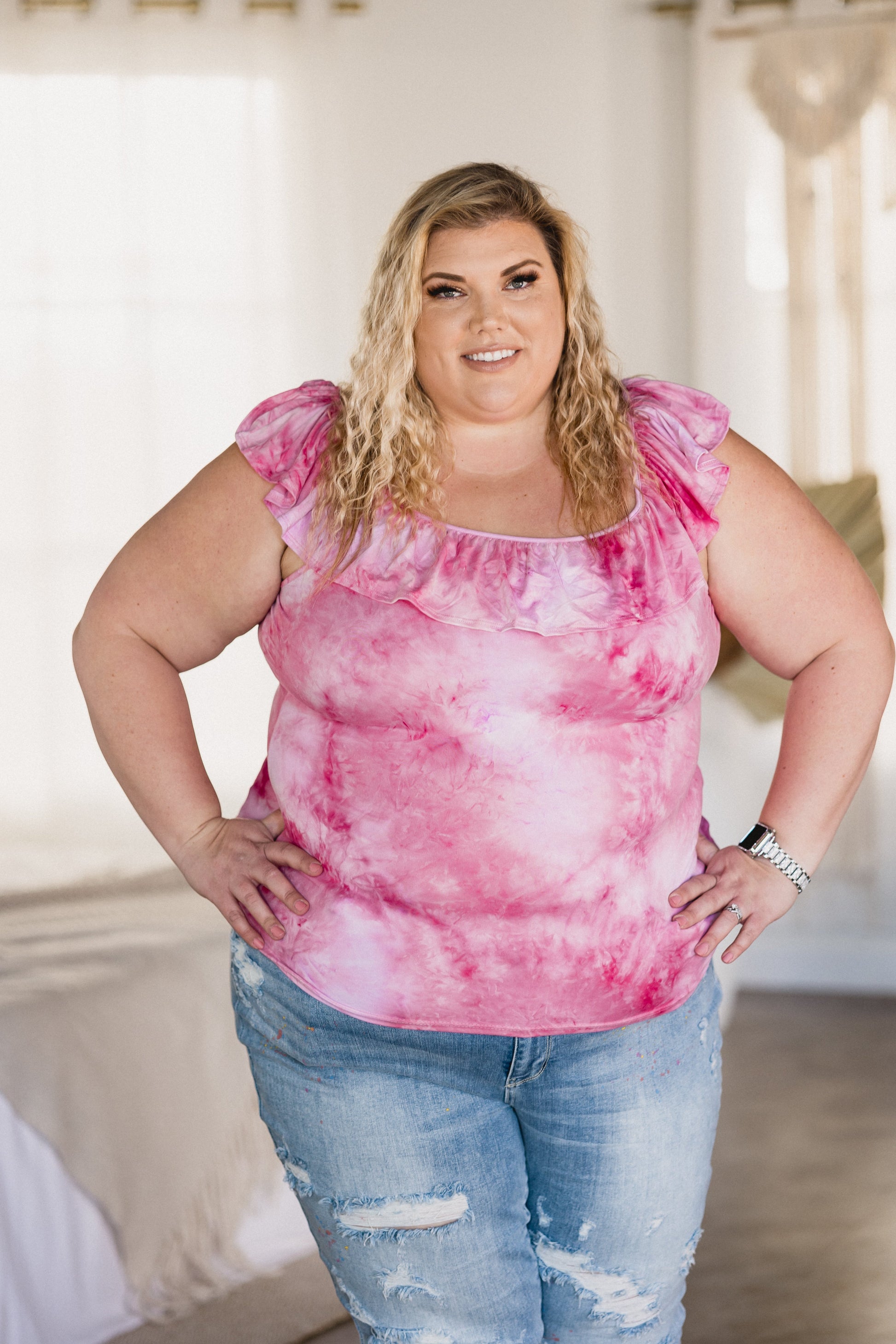 Keep summer going all year long with this buttery soft pink tie dye ruffled top. Made from buttery soft baby suede , this top features a semi fitted silhouette, a boat neck that can be worn on or off the shoulder and ruffle trim.